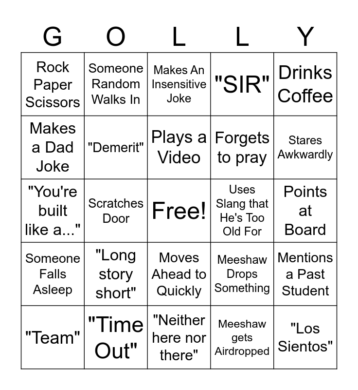 This bingo card has a free space and 35 words: "A Three, A Two, A Juan", "This is True", *Tilts Podium*, "Demerit", Moves Ahead to Quickly, "SIR", Makes a Dad Joke, Answers the Phone With a Joke, Plays a Video, Falke Gets In Trouble, "You're built like a...", Drinks Coffee, Room Smells Weird, Pulls up Someone's Screen on the Board, Rock Paper Scissors, Uses Slang that He's Too Old For, Meeshaw gets Airdropped, Scratches Door, Someone Falls Asleep, "Los Sientos", Meeshaw Drops Something, "Team", Mentions a Past Student, "Time Out", Makes An Insensitive Joke, Stares Awkwardly, Someone gets caught eating, Draws on White Board, Forgets to pray, Points at Board, References Pop Culture, "Neither here nor there", "Long story short", Someone Random Walks In and "Alrighty Kiddos".