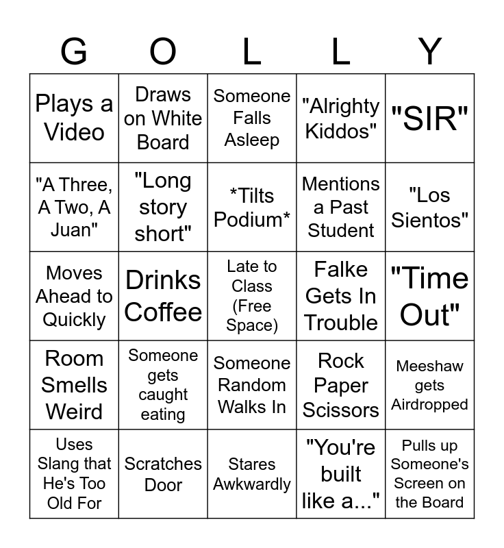 This bingo card has a free space and 35 words: Points at Board, References Pop Culture, "Neither here nor there", "Long story short", Someone Random Walks In, "Alrighty Kiddos", "A Three, A Two, A Juan", "This is True", *Tilts Podium*, "Demerit", Moves Ahead to Quickly, "SIR", Makes a Dad Joke, Answers the Phone With a Joke, Plays a Video, Falke Gets In Trouble, "You're built like a...", Drinks Coffee, Room Smells Weird, Pulls up Someone's Screen on the Board, Rock Paper Scissors, Uses Slang that He's Too Old For, Meeshaw gets Airdropped, Scratches Door, Someone Falls Asleep, "Los Sientos", Meeshaw Drops Something, "Team", Mentions a Past Student, "Time Out", Makes An Insensitive Joke, Stares Awkwardly, Someone gets caught eating, Draws on White Board and Forgets to pray.