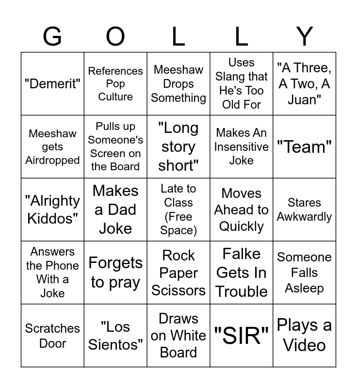 This bingo card has a free space and 35 words: "You're built like a...", Drinks Coffee, Room Smells Weird, Pulls up Someone's Screen on the Board, Rock Paper Scissors, Uses Slang that He's Too Old For, Meeshaw gets Airdropped, "Neither here nor there", "Long story short", Someone Random Walks In, "Alrighty Kiddos", "A Three, A Two, A Juan", "This is True", *Tilts Podium*, "Demerit", Moves Ahead to Quickly, "SIR", Makes a Dad Joke, Answers the Phone With a Joke, Plays a Video, Falke Gets In Trouble, Scratches Door, Someone Falls Asleep, "Los Sientos", Meeshaw Drops Something, "Team", Mentions a Past Student, "Time Out", Makes An Insensitive Joke, Stares Awkwardly, Someone gets caught eating, Draws on White Board, Forgets to pray, References Pop Culture and Points at Board.