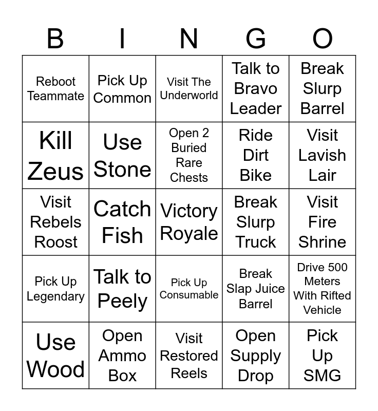 This bingo card has a free space and 100 words: Visit Air Shrine, Visit Earth Shrine, Visit Fire Shrine, Visit Water Shrine, Destroy Cabbage Cart, Open God Chest, Open Chest, Open Buried Chest, Open Rare Chest, Open Weapon Case, Enter Bunker, Enter Vault, Collect Floor Loot, Open Ammo Box, Purchase From Vending Machine, Use Launch Pad, Ride Dirt Bike, Ride Whiplash, Ride TrailSmasher, Jump On Tires, Enter Port-a-Potty, Use Zipline, Use Gas Station, Use Campfire, Use Flow Berries, Break Slurp Truck, Break Slurp Barrel, Break Slap Juice Barrel, Open Produce Box, Open Fishing Rod Barrel, Catch Fish, Reboot Teammate, Pick Up Fireflies, Complete Bounty, Open Supply Drop, Open 2 Buried Rare Chests, Drive 500 Meters With Rifted Vehicle, Claim Radio Tower, Open Safe, Open Cash Register, Enter Bush, Enter Dumpster, Visit Rebels Roost, Visit Classy Courts, Visit Lavish Lair, Visit The Underworld, Visit Grim Gate, Visit Reckless Railways, Visit Grand Glacier, Visit Restored Reels, Visit Pleasant Piazza, Visit Fencing Fields, Visit Snooty Stepps, Visit Mount Olympus, Visit Brawlers Battleground, Talk to Artemis, Talk to Meowcles, Talk to Myna, Talk to Laguna, Talk to Bravo Leader, Talk to Poseidon, Talk to Medusa, Talk to Aphrodite, Talk to Spartan Assassin, Talk to Hope, Talk to Khari, Talk to Clara, Talk to Jittershock, Talk to Etheria, Talk to Charon, Talk to Noorah, Talk to Peely, Talk to Apollo, Talk to Graveheart, Kill Cerberus, Kill Hades, Kill Ares, Kill Zeus, Emote, Pick Up Assault Rifle, Pick Up Shotgun, Pick Up SMG, Pick Up Sniper, Pick Up Consumable, Pick Up Melee, Pick Up Common, Pick Up Uncommon, Pick Up Rare, Pick Up Epic, Pick Up Legendary, Pick Up Mythic, Pick Up Medalion, Pick Up Crown, Use Wood, Use Stone, Use Metal, Kill Player, Kill NPC, Hire NPC and Kill Darth Vader.