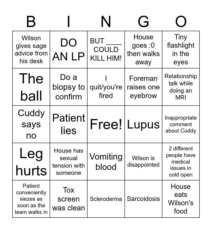 This bingo card has a free space and 24 words: House has sexual tension with someone, Tox screen was clean, I quit/you're fired, Patient conveniently siezes as soon as the team walks in, Tiny flashlight in the eyes, Wilson gives sage advice from his desk, The ball, DO AN LP, Lupus, Vomiting blood, Foreman raises one eyebrow, Cuddy says no, Wilson is disappointed, 2 different people have medical issues in cold open, Do a biopsy to confirm, Sarcoidosis, Inappropriate comment about Cuddy, BUT ____ COULD KILL HIM!, Relationship talk while doing an MRI, Patient lies, House eats Wilson's food, Leg hurts, House goes :0 then walks away and Scleroderma.