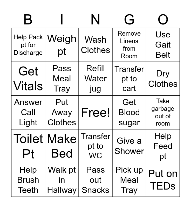 This bingo card has a free space and 24 words: Make Bed, Walk pt in Hallway, Refill Water jug, Help Brush Teeth, Use Gait Belt, Help Pack pt for Discharge, Get Vitals, Weigh pt, Get Blood sugar, Transfer pt to WC, Transfer pt to cart, Answer Call Light, Give a Shower, Help Feed pt, Pass Meal Tray, Pick up Meal Tray, Take garbage out of room, Wash Clothes, Dry Clothes, Put Away Clothes, Put on TEDs, Toilet Pt, Remove Linens from Room and Pass out Snacks.