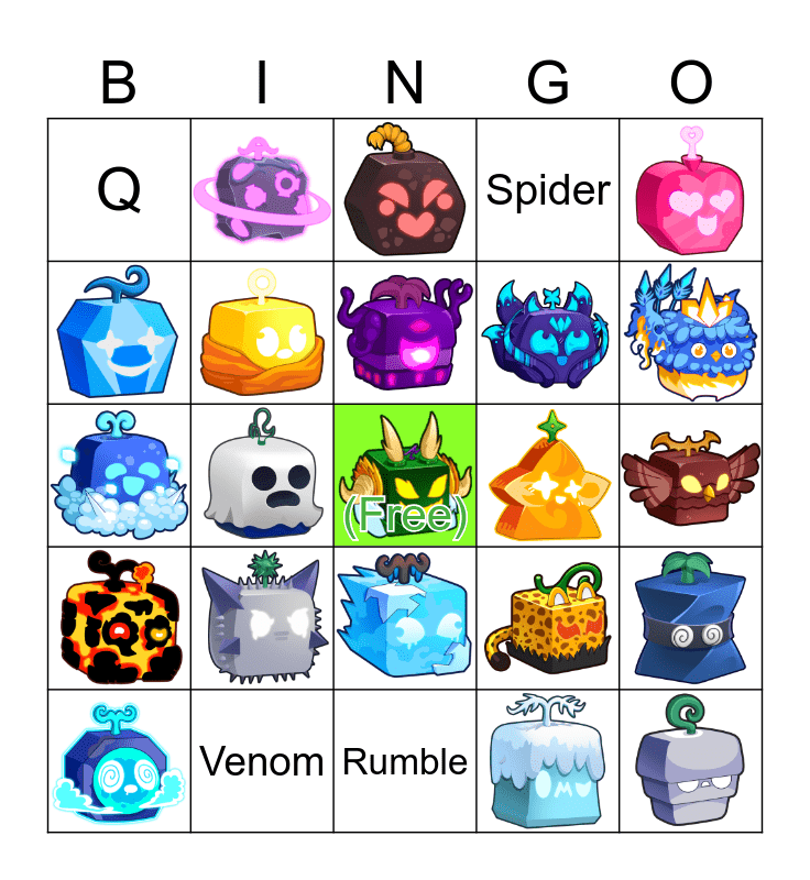 This bingo card has 27 images, a free space and 10 words: Sand, Rubber, Spider, Sound, Q, Rumble, T-Rex, Shadow, Venom and Spirit.
