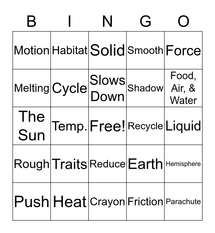 This bingo card has a free space and 24 words: Traits, Heat, Slows Down, Push, Force, Motion, Melting, Habitat, Recycle, Reduce, Shadow, The Sun, Earth, Hemisphere, Cycle, Friction, Liquid, Solid, Food, Air, & Water, Temp., Parachute, Rough, Smooth and Crayon.