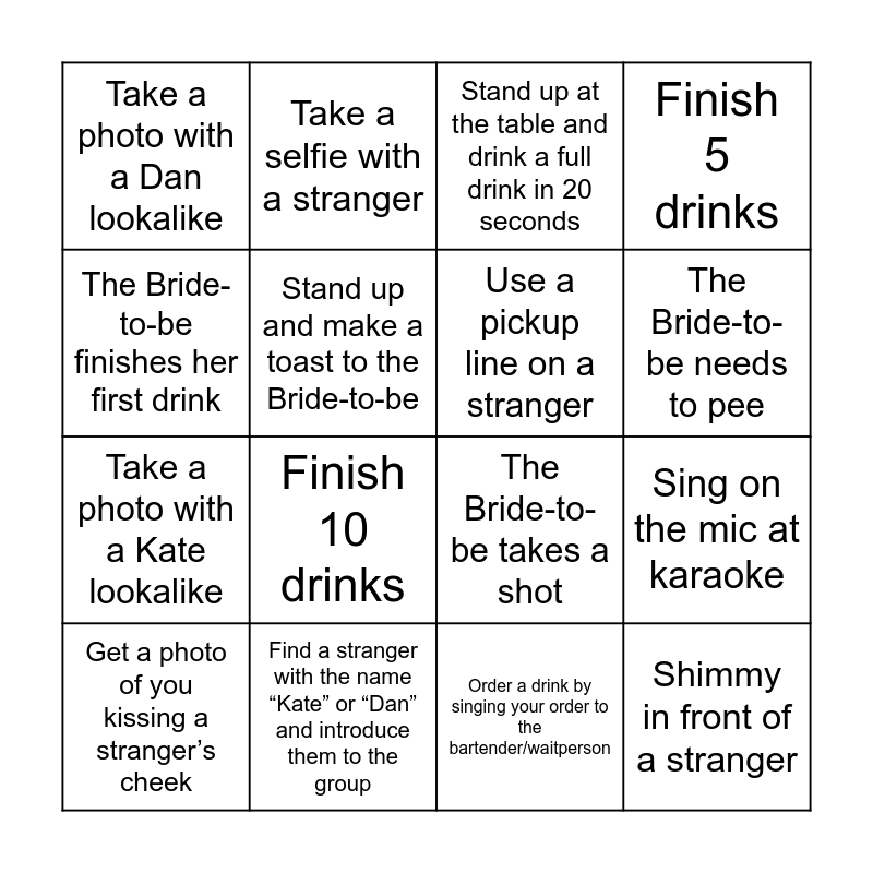 This bingo card has 16 words: Find a stranger with the name “Kate” or “Dan” and introduce them to the group, Sing on the mic at karaoke, Stand up at the table and drink a full drink in 20 seconds, Take a photo with a Dan lookalike, Take a photo with a Kate lookalike, Take a selfie with a stranger, The Bride-to-be takes a shot, Order a drink by singing your order to the bartender/waitperson, The Bride-to-be finishes her first drink, Stand up and make a toast to the Bride-to-be, Get a photo of you kissing a stranger’s cheek, Finish 5 drinks, Finish 10 drinks, The Bride-to-be needs to pee, Use a pickup line on a stranger and Shimmy in front of a stranger.