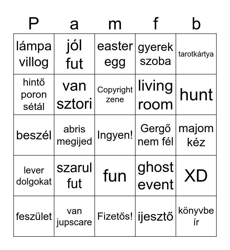 This bingo card has a free space and 24 words: feszület, szarul fut, Copyright zene, ijesztő, tarotkártya, lámpa villog, jól fut, easter egg, Gergő nem fél, majom kéz, beszél, van sztori, ghost event, XD, hintő poron sétál, van jupscare, Fizetős!, gyerek szoba, hunt, lever dolgokat, abris megijed, fun, living room and könyvbe ír.