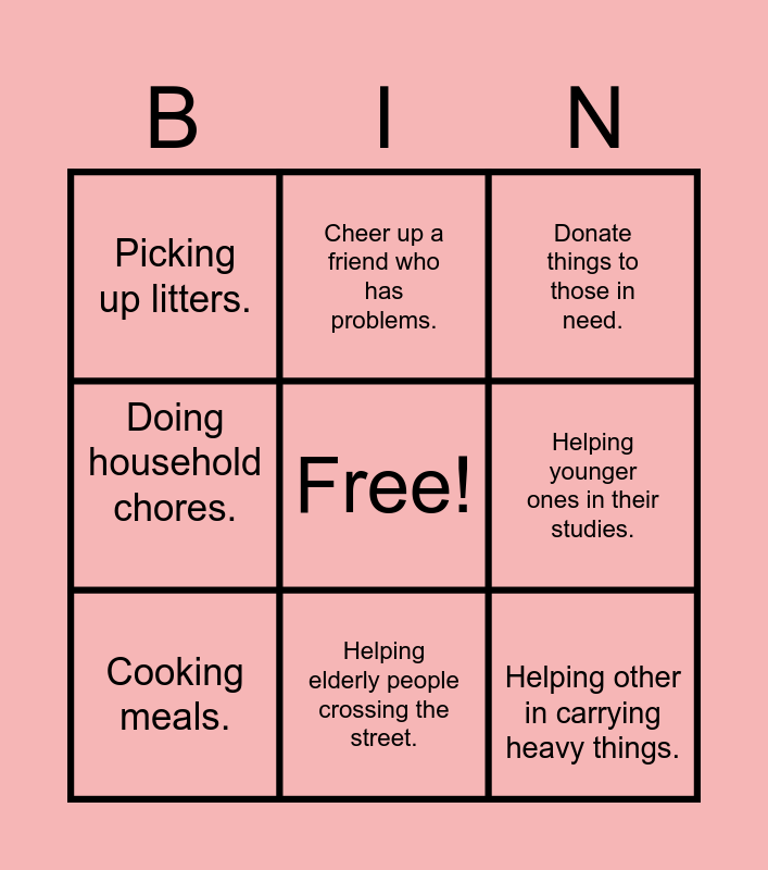 This bingo card has a free space and 8 words: Doing household chores., Cheer up a friend who has problems., Helping younger ones in their studies., Cooking meals., Donate things to those in need., Picking up litters., Helping elderly people crossing the street. and Helping other in carrying heavy things..