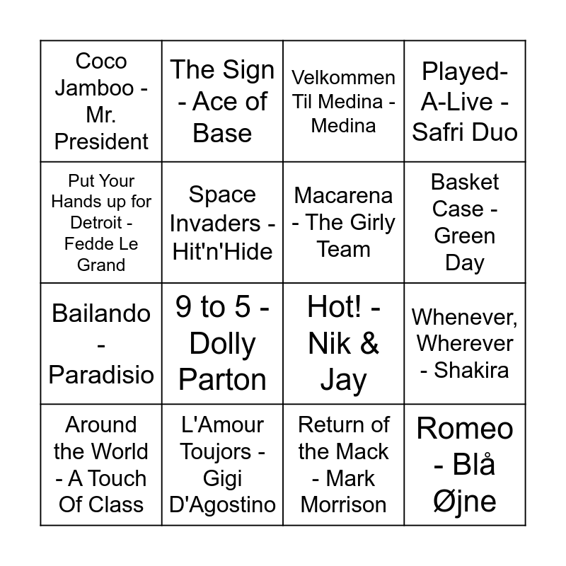 This bingo card has 43 words: Turn Me On - Kevin Lyttle, Around the World - A Touch Of Class, Freestyler - Bomfunk MC's, Low - Flo Rida, Flute - Barcode Brothers, Hey Baby - DJ Ötzi, Velkommen Til Medina - Medina, Toxic - Britney Spears, Put Your Hands up for Detroit - Fedde Le Grand, Crazy In Love - Beyoncé, Played-A-Live - Safri Duo, L'Amour Toujors - Gigi D'Agostino, The Whistle Song - DJ Aligator, Heaven - DJ Sammy, Hot In Herre - Nelly, Temperature - Sean Paul, Boten Anna - Basshunter, Hot! - Nik & Jay, Boom, Boom, Boom - Vengaboys, 9 to 5 - Dolly Parton, The Sign - Ace of Base, Vill ha dig - Drömhus, Calabria 2008 - Natasja, Coco Jamboo - Mr. President, This Is How We Party - S.O.A.P., Return of the Mack - Mark Morrison, Mysterious Girl - Peter Andre, Everybody - Backstreet Boys, Kom Tilbage Nu - Danseorkestret, Romeo - Blå Øjne, Jump Around - House Of Pain, Spændt Op Til Lir - Den Gale Pose, Saturday Night - Whigfield, Whenever, Wherever - Shakira, Fugle - Djämes Braun, It's Like That - Run–D.M.C., U Can't Touch - MC Hammer, Basket Case - Green Day, Space Invaders - Hit'n'Hide, Bailando - Paradisio, Dub-I-Dub - Me & My, Macarena - The Girly Team and Vamos a la Playa - Loona.