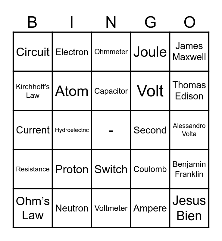 This bingo card has a free space and 50 words: Electricity, Neutron, Transformer, Ampere, Benjamin Franklin, Voltage, Electron, L.E.D., Volt, Edison Mojica, Kirchhoff's Law, Atom, Coulomb, Jesus Bien, Magnetism, Lightning, Ohmmeter, Second, Michael Faraday, Circuit, Proton, Voltmeter, Joule, Thomas Edison, AC Power, Conductor, Capacitor, Watt, James Maxwell, Resistance, Solar, Ammeter, Farad, Kaycee Victorio, DC Power, Insulator, Inductor, Hertz, Nikola Tesla, Current, Geothermal, Motor, Ohm, Alexander Bell, Ohm’s Law, Hydroelectric, Switch, Henry, Alessandro Volta and Battery.