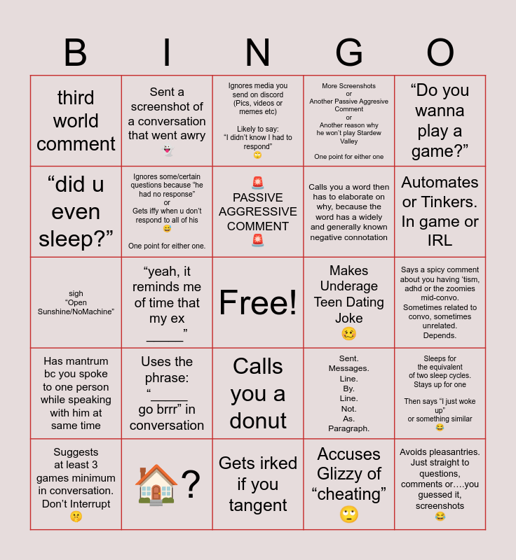 This bingo card has a free space and 24 words: Suggests at least 3 games minimum in conversation. Don’t Interrupt 🤫, Uses the phrase: “_____ go brrr” in conversation, 🚨 PASSIVE AGGRESSIVE COMMENT 🚨, Accuses Glizzy of “cheating” 🙄, “Do you wanna play a game?”, third world comment, Sent a screenshot of a conversation that went awry 👻, Ignores media you send on discord (Pics, videos or memes etc) Likely to say: “I didn’t know I had to respond” 🙄, Makes Underage Teen Dating Joke 🥴, Says a spicy comment about you having ‘tism, adhd or the zoomies mid-convo. Sometimes related to convo, sometimes unrelated. Depends., sigh “Open Sunshine/NoMachine”, Ignores some/certain questions because “he had no response” or Gets iffy when u don’t respond to all of his 😅 One point for either one., Sent. Messages. Line. By. Line. Not. As. Paragraph., Sleeps for the equivalent of two sleep cycles. Stays up for one Then says “I just woke up” or something similar 😂, “did u even sleep?”, 🏠?, Gets irked if you tangent, More Screenshots or Another Passive Aggresive Comment or Another reason why he won’t play Stardew Valley One point for either one, Automates or Tinkers. In game or IRL, Has mantrum bc you spoke to one person while speaking with him at same time, “yeah, it reminds me of time that my ex _____”, Calls you a donut, Calls you a word then has to elaborate on why, because the word has a widely and generally known negative connotation and Avoids pleasantries. Just straight to questions, comments or….you guessed it, screenshots 😂.