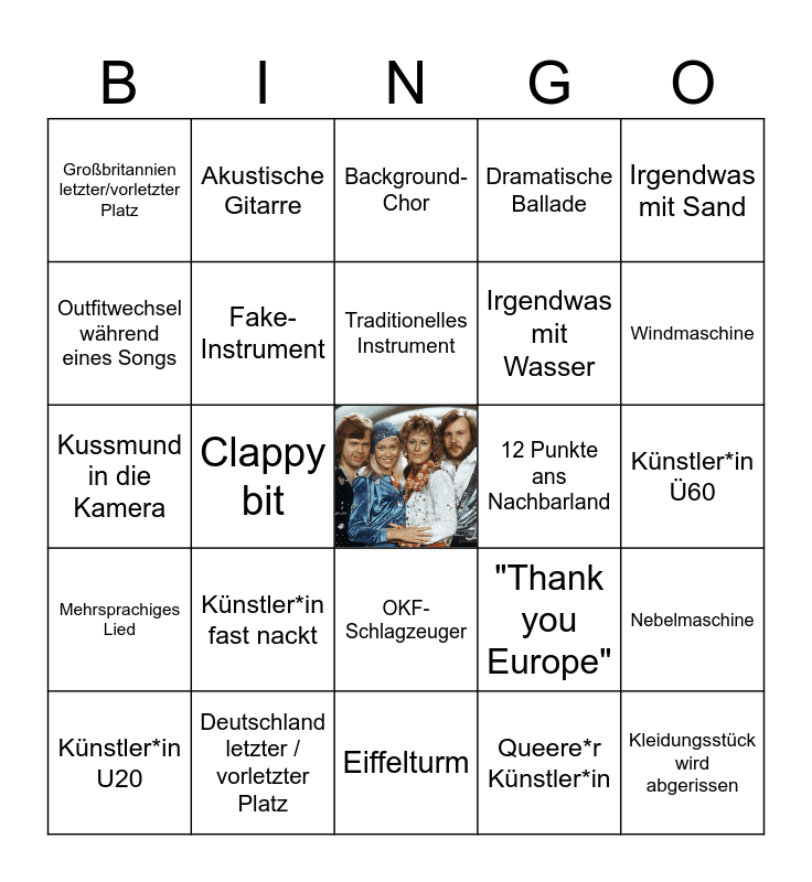 This bingo card has a free space and 32 words: Pyrotechnik, Deutschland letzter / vorletzter Platz, Eiffelturm, Tränen, Windmaschine, Großbritannien letzter/vorletzter Platz, Clappy bit, OKF-Schlagzeuger, Dramatische Ballade, Kleidungsstück wird abgerissen, Outfitwechsel während eines Songs, Akustische Gitarre, Queere*r Künstler*in, Outfit mit Federn, Mehrsprachiges Lied, Streichinstrument, Saxophon, 12 Punkte ans Nachbarland, Künstler*in Ü60, Künstler*in U20, Künstler*in fast nackt, Technische Probleme, "Thank you Europe", Nebelmaschine, Kussmund in die Kamera, Fake-Instrument, Background-Chor, Irgendwas mit Wasser, Irgendwas mit Sand, Jemand fällt auf die Knie, Germany zero points and Traditionelles Instrument.