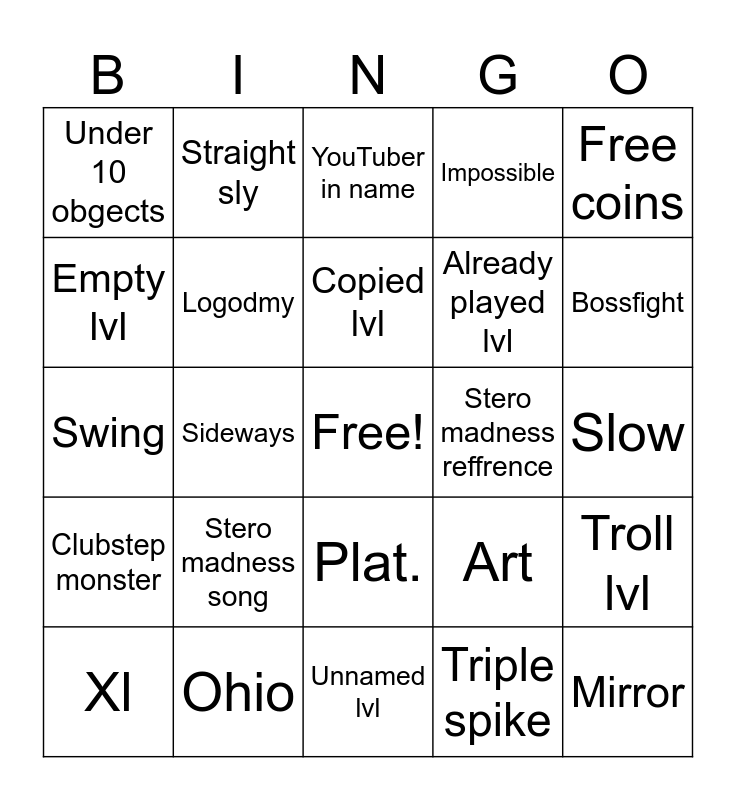 This bingo card has a free space and 24 words: Stero madness song, Ohio, Copied lvl, Xl, Free coins, Under 10 obgects, Empty lvl, Straight sly, Stero madness reffrence, Plat., Already played lvl, Swing, Art, Troll lvl, Logodmy, Triple spike, Slow, YouTuber in name, Bossfight, Sideways, Mirror, Clubstep monster, Impossible and Unnamed lvl.