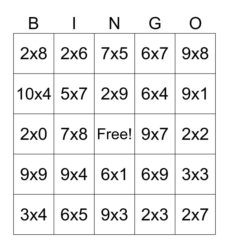 This bingo card has a free space and 24 words: 9x4, 6x5, 2x9, 3x4, 9x8, 2x8, 10x4, 2x6, 9x7, 6x1, 6x4, 2x0, 6x9, 3x3, 5x7, 2x3, 2x2, 7x5, 9x1, 7x8, 2x7, 9x9, 6x7 and 9x3.