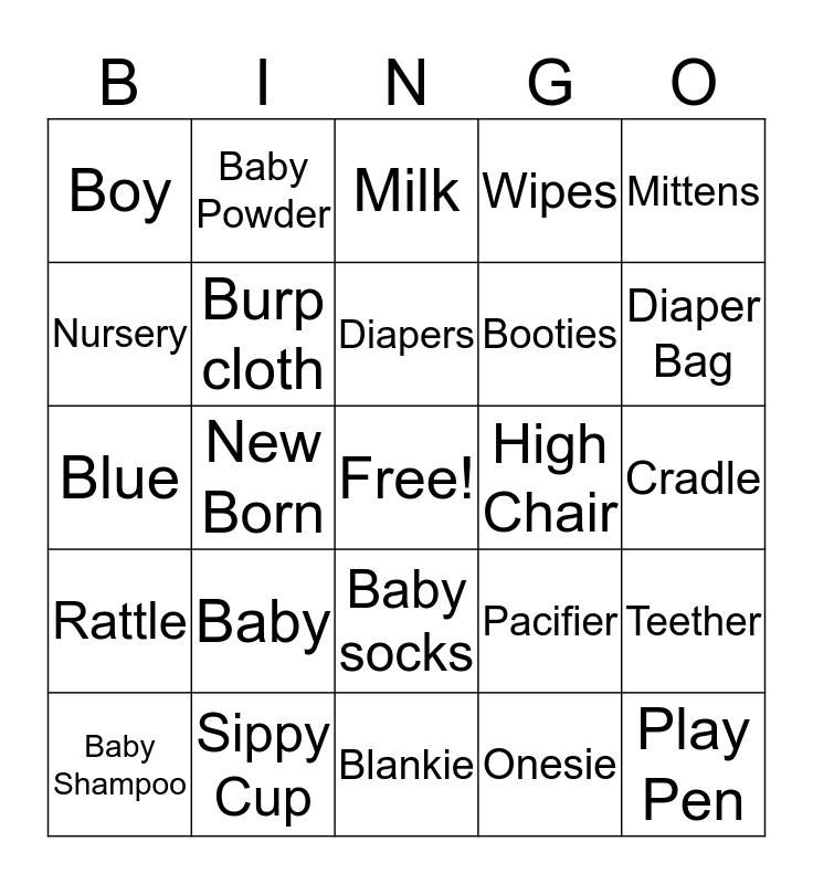 This bingo card has a free space and 24 words: Baby, Sippy Cup, Diapers, Baby Shampoo, Mittens, Boy, Nursery, Baby Powder, High Chair, Baby socks, Booties, Blue, Pacifier, Teether, Burp cloth, Onesie, Cradle, Milk, Diaper Bag, New Born, Play Pen, Rattle, Wipes and Blankie.