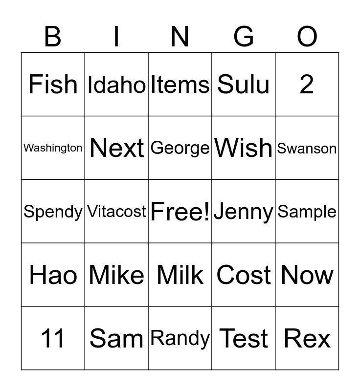 This bingo card has a free space and 24 words: Mike, Sam, George, 11, 2, Fish, Washington, Idaho, Jenny, Milk, Wish, Spendy, Cost, Now, Next, Test, Sample, Items, Swanson, Vitacost, Rex, Hao, Sulu and Randy.