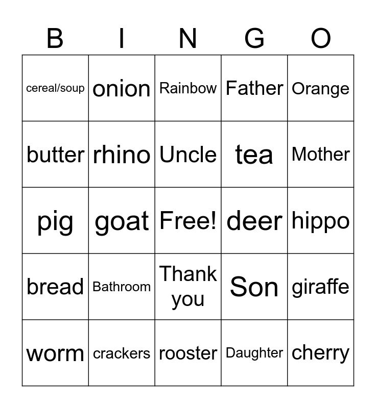 This bingo card has a free space and 106 words: White, Black, Orange, Yellow, Green, Blue, Purple, Pink, Red, Brown, Grey, Light, Dark, Color, Sparkly, Bright, Rainbow, “My Name”, “Nice to Meet”, Please, Thank you, Sorry, Help, More, All Done, Bathroom, Mother, Father, Sister, Brother, Son, Daughter, Niece, Nephew, Cousin, Grandpa, Grandma, Aunt, Uncle, Step-Mom, Step-Dad, apple, banana, bread, burger, butter, carrot, cereal/soup, cheese, cherry, corn, crackers, drink, egg, french fry, fruit, grapes, ice cream, milk, onion, pasta, pie, sandwich, water, watermelon, restaurant, cookie, soda, tea, pig, goat, rooster, cat, dog, lion, alligator, elephant, monkey, gorilla, tiger, wolf, owl, raccoon, skunk, bear, cow, deer, fox, bird, duck, turkey, eagle, horse, donkey, buffalo, giraffe, mouse, rat, turtle, hippo, rhino, penguin, ant, butterfly, worm and fish.