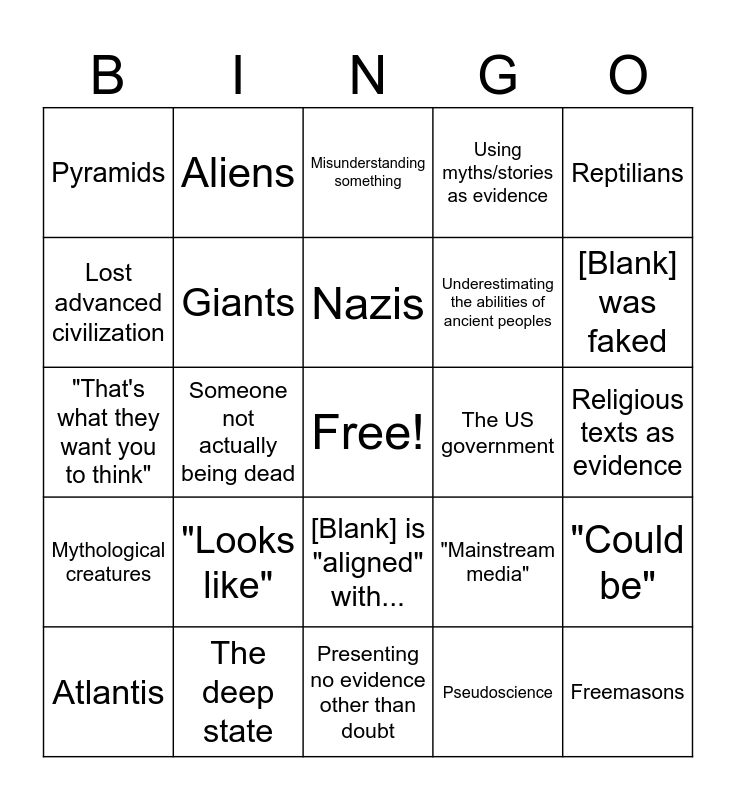 This bingo card has a free space and 24 words: "Looks like", The deep state, Nazis, Atlantis, Reptilians, Pyramids, Lost advanced civilization, Aliens, The US government, [Blank] is "aligned" with..., Underestimating the abilities of ancient peoples, "That's what they want you to think", "Mainstream media", "Could be", Giants, Pseudoscience, Religious texts as evidence, Misunderstanding something, [Blank] was faked, Someone not actually being dead, Freemasons, Mythological creatures, Using myths/stories as evidence and Presenting no evidence other than doubt.