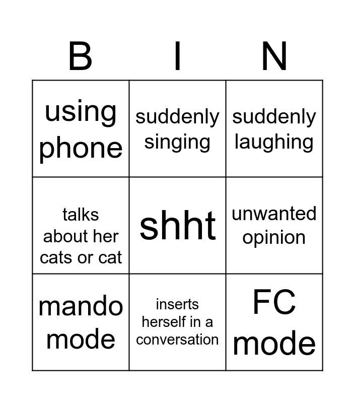 This bingo card has a free space and 8 words: unwanted opinion, suddenly laughing, suddenly singing, mando mode, using phone, FC mode, talks about her cats or cat and inserts herself in a conversation.