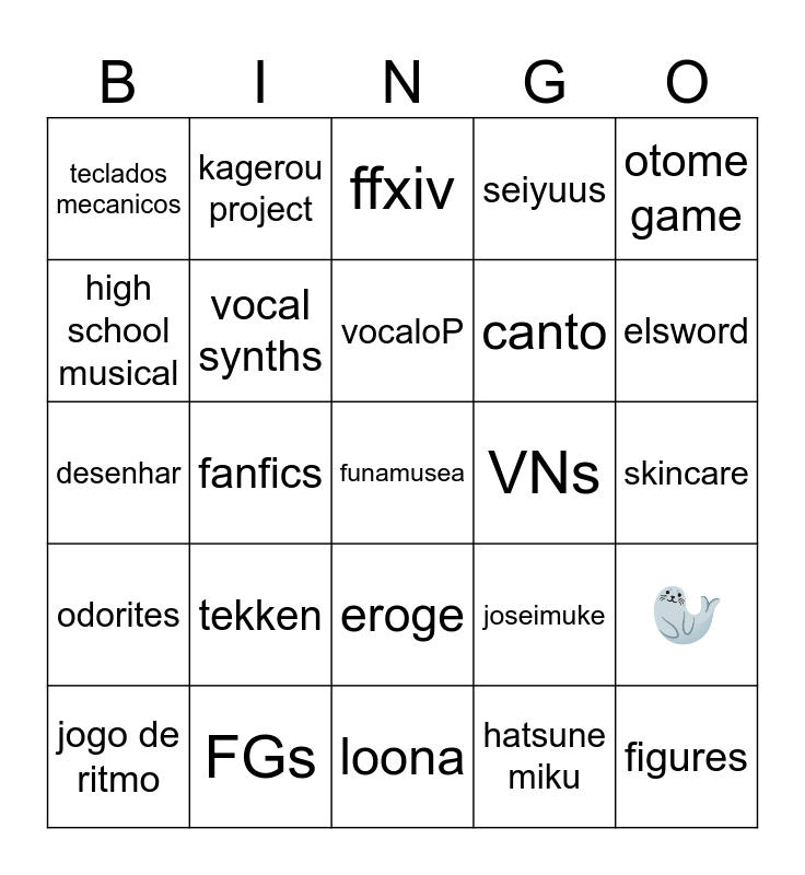 This bingo card has 25 words: tekken, loona, vocaloP, jogo de ritmo, otome game, teclados mecanicos, high school musical, kagerou project, VNs, eroge, canto, desenhar, joseimuke, 🦭, vocal synths, figures, skincare, ffxiv, elsword, fanfics, funamusea, FGs, odorites, seiyuus and hatsune miku.