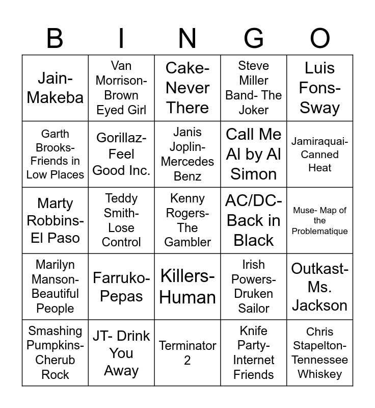 This bingo card has 27 words: Irish Powers- Druken Sailor, Chris Stapelton- Tennessee Whiskey, Call Me Al by Al Simon, Terminator 2, Garth Brooks- Friends in Low Places, Cake- Never There, Van Morrison- Brown Eyed Girl, Marilyn Manson- Beautiful People, AC/DC- Back in Black, Outkast- Ms. Jackson, Marty Robbins- El Paso, Steve Miller Band- The Joker, Smashing Pumpkins- Cherub Rock, JT- Drink You Away, Jamiraquai- Canned Heat, Bob Seger- Hollywood Nights, Gorillaz- Feel Good Inc., Janis Joplin- Mercedes Benz, Farruko- Pepas, Jain- Makeba, Muse- Map of the Problematique, Knife Party- Internet Friends, Teddy Smith- Lose Control, Kenny Rogers- The Gambler, Killers-Human, Luis Fons- Sway and Renalto Carsone- Tu Vou fa L-americano.