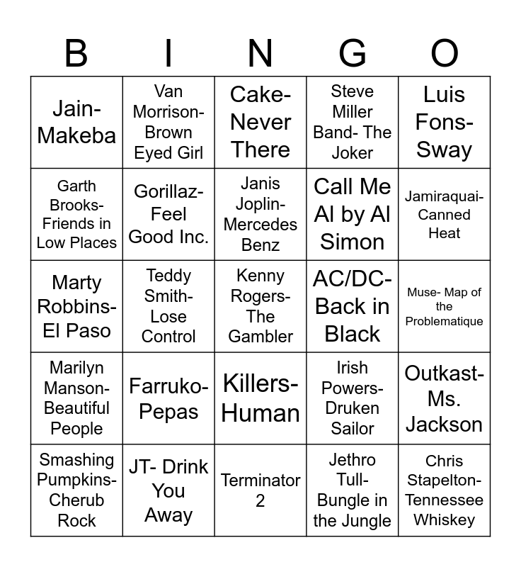 This bingo card has 27 words: Irish Powers- Druken Sailor, Chris Stapelton- Tennessee Whiskey, Call Me Al by Al Simon, Terminator 2, Garth Brooks- Friends in Low Places, Cake- Never There, Van Morrison- Brown Eyed Girl, Marilyn Manson- Beautiful People, AC/DC- Back in Black, Outkast- Ms. Jackson, Marty Robbins- El Paso, Steve Miller Band- The Joker, Smashing Pumpkins- Cherub Rock, JT- Drink You Away, Jamiraquai- Canned Heat, Bob Seger- Hollywood Nights, Gorillaz- Feel Good Inc., Janis Joplin- Mercedes Benz, Farruko- Pepas, Jain- Makeba, Muse- Map of the Problematique, Jethro Tull- Bungle in the Jungle, Teddy Smith- Lose Control, Kenny Rogers- The Gambler, Killers-Human, Luis Fons- Sway and Renalto Carsone- Tu Vou fa L-americano.