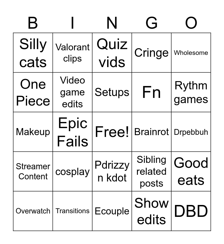 This bingo card has a free space and 24 words: cosplay, Transitions, Setups, Overwatch, Wholesome, Silly cats, One Piece, Valorant clips, Brainrot, Pdrizzy n kdot, Fn, Makeup, Sibling related posts, Good eats, Video game edits, Show edits, Drpebbuh, Quiz vids, Rythm games, Epic Fails, DBD, Streamer Content, Cringe and Ecouple.