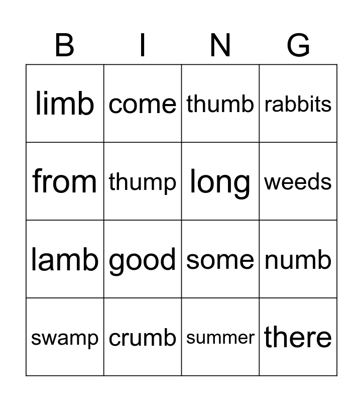 This bingo card has 16 words: crumb, numb, thumb, limb, lamb, come, some, summer, from, thump, swamp, rabbits, good, weeds, long and there.
