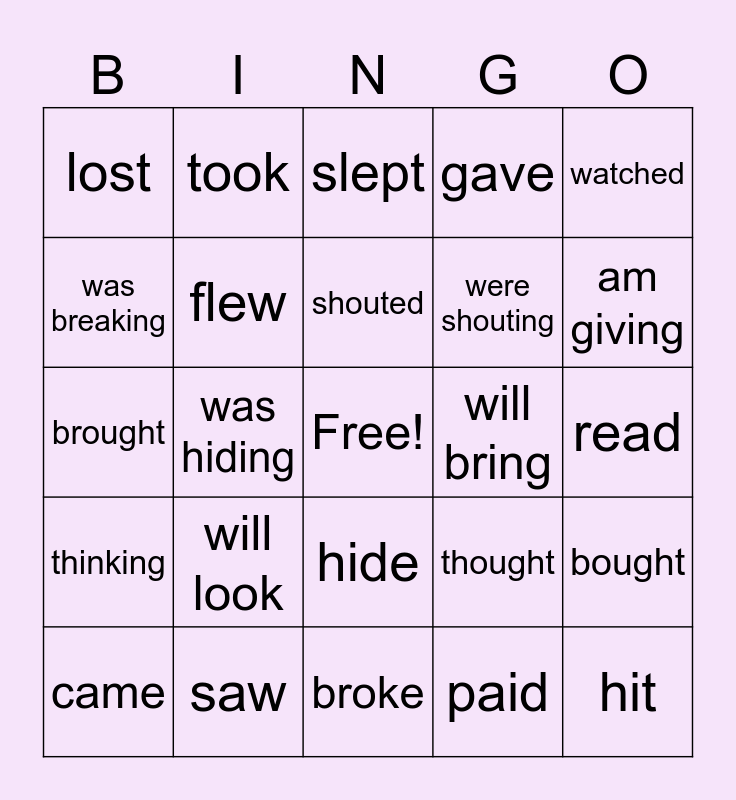 This bingo card has a free space and 24 words: will look, saw, shouted, came, watched, lost, was breaking, took, will bring, hide, were shouting, brought, thought, bought, flew, paid, read, slept, am giving, was hiding, hit, thinking, gave and broke.