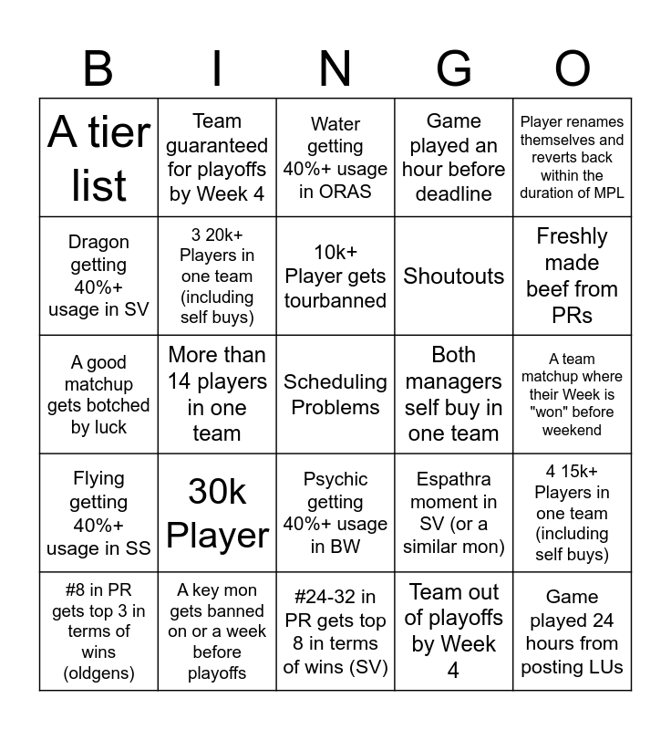 This bingo card has a free space and 37 words: 7-0 Player, 3k Player gets 3-0 or better, 15k+ Player gets 0-3 or worse, 3 20k+ Players in one team (including self buys), 4 15k+ Players in one team (including self buys), 30k Player, 10k+ Player gets tourbanned, Player gets banned from Smogon mid tourney, Player renames themselves and reverts back within the duration of MPL, Tour player comes to love monotype, More than 14 players in one team, Game played an hour before deadline, Game played 24 hours from posting LUs, A team matchup where their Week is "won" before weekend, Dragon getting 40%+ usage in SV, Flying getting 40%+ usage in SS, Flying getting 40%+ usage in USUM, Water getting 40%+ usage in ORAS, Psychic getting 40%+ usage in BW, Both managers self buy in one team, A tier list, Freshly made beef from PRs, #8 in PR gets top 3 in terms of wins (oldgens), #24-32 in PR gets top 8 in terms of wins (SV), Act call on important week, Team out of playoffs by Week 4, Team guaranteed for playoffs by Week 4, Team gets 8-0 in one week, Team gets more than three ties in season, Finals tiebreaks ends up in sub, Suspect test during MPL, A key mon gets banned on or a week before playoffs, A good matchup gets botched by luck, A bad matchup won in a grueling match, Espathra moment in SV (or a similar mon), Shoutouts and Manager beef because of scheduling.