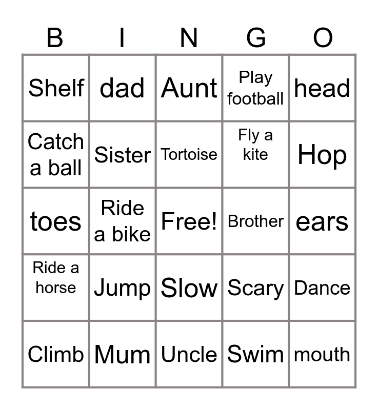 This bingo card has a free space and 24 words: Jump, Mum, Tortoise, Climb, head, Shelf, Catch a ball, dad, Brother, Slow, Fly a kite, toes, Scary, Dance, Sister, Swim, ears, Aunt, Hop, Ride a bike, mouth, Ride a horse, Play football and Uncle.