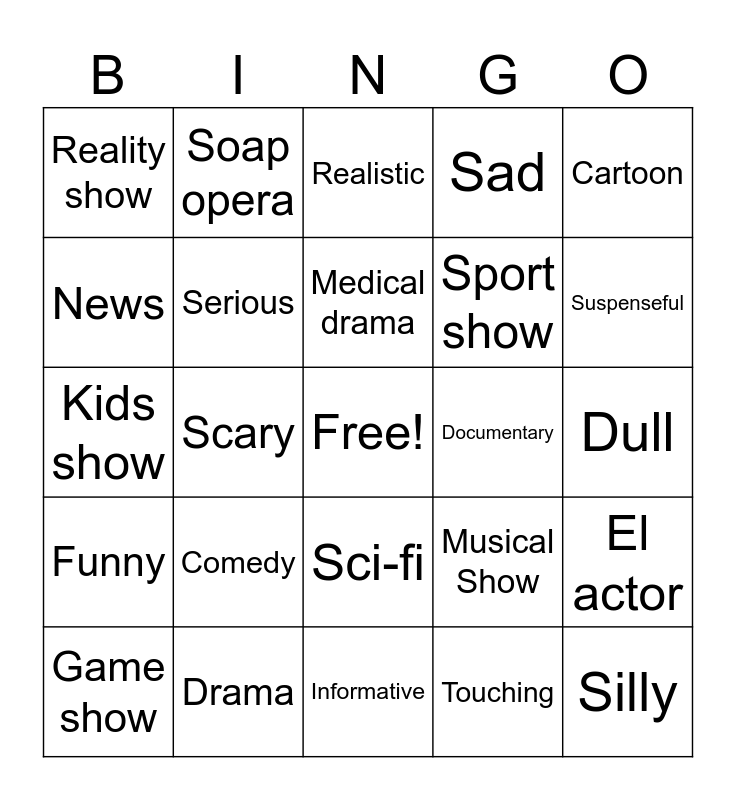 This bingo card has a free space and 24 words: Comedy, Drama, Medical drama, Game show, Cartoon, Reality show, News, Soap opera, Documentary, Sci-fi, Sport show, Kids show, Musical Show, El actor, Serious, Touching, Dull, Realistic, Suspenseful, Scary, Silly, Funny, Sad and Informative.