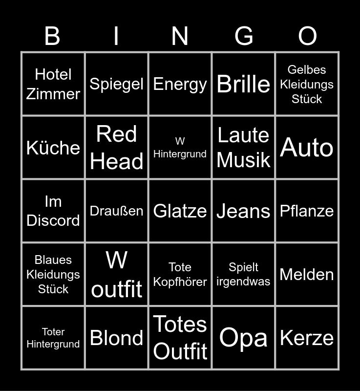 This bingo card has 25 words: W outfit, Totes Outfit, W Hintergrund, Toter Hintergrund, Gelbes Kleidungs Stück, Hotel Zimmer, Küche, Spiegel, Jeans, Tote Kopfhörer, Laute Musik, Im Discord, Spielt irgendwas, Melden, Red Head, Kerze, Pflanze, Energy, Auto, Draußen, Glatze, Blond, Blaues Kleidungs Stück, Brille and Opa.