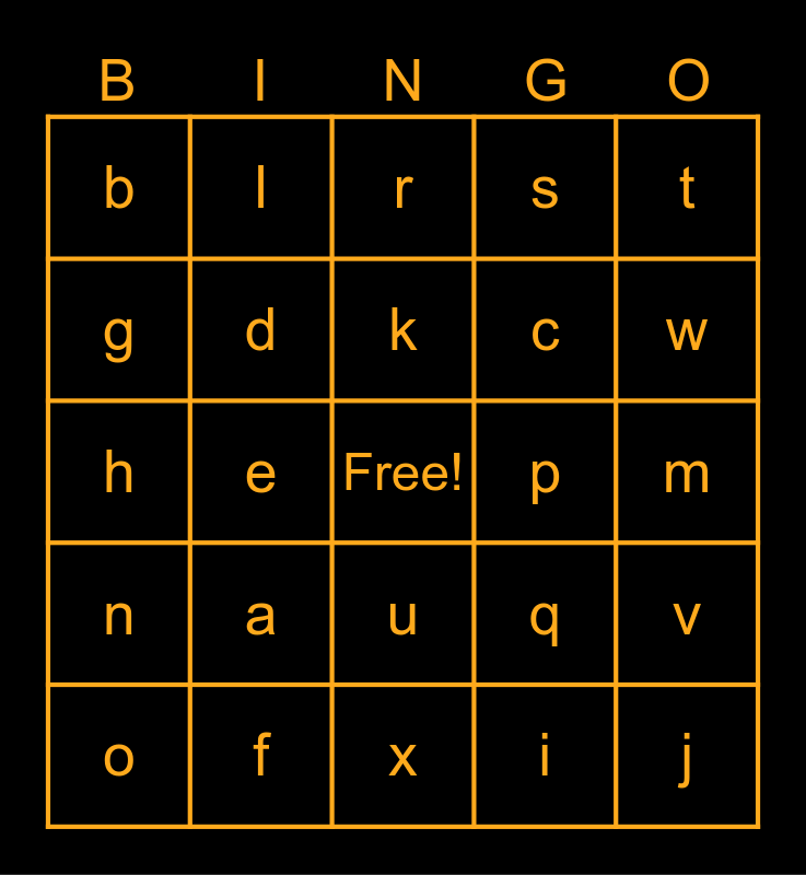This bingo card has a free space and 24 words: a, f, k, o, t, b, g, l, p, u, c, h, q, v, d, i, m, r, w, e, j, n, s and x.