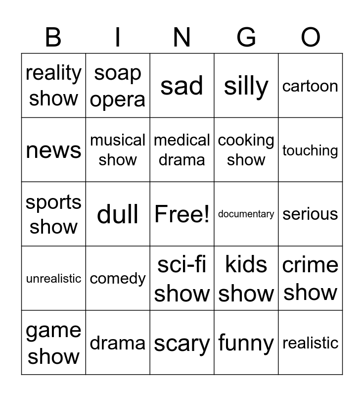 This bingo card has a free space and 24 words: comedy, drama, medical drama, game show, cartoon, reality show, news, soap opera, documentary, sci-fi show, cooking show, sports show, kids show, crime show, musical show, funny, serious, sad, touching, dull, realistic, unrealistic, silly and scary.