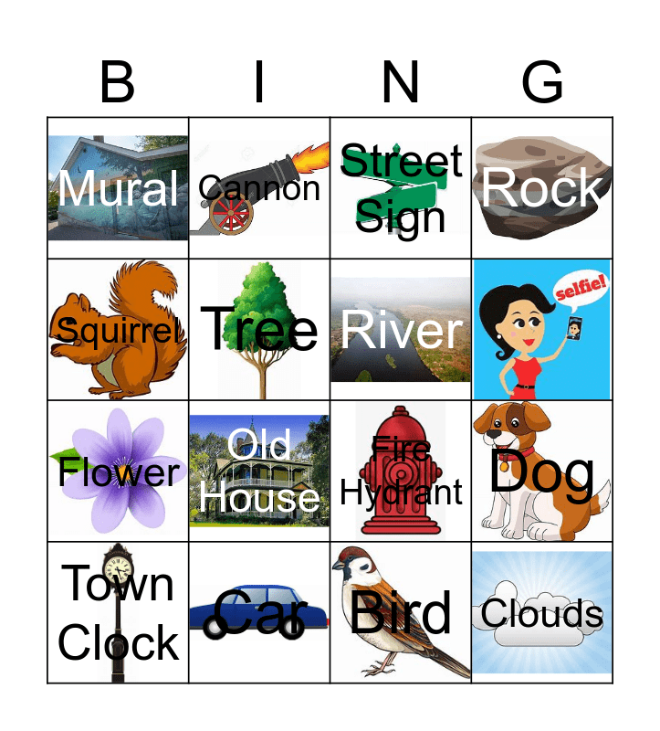 This bingo card has 16 images and 15 words: Car, Dog, Street Sign, Mural, Flower, Cannon, Fire Hydrant, Bird, Squirrel, Tree, Town Clock, Rock, Old House, River and Clouds.