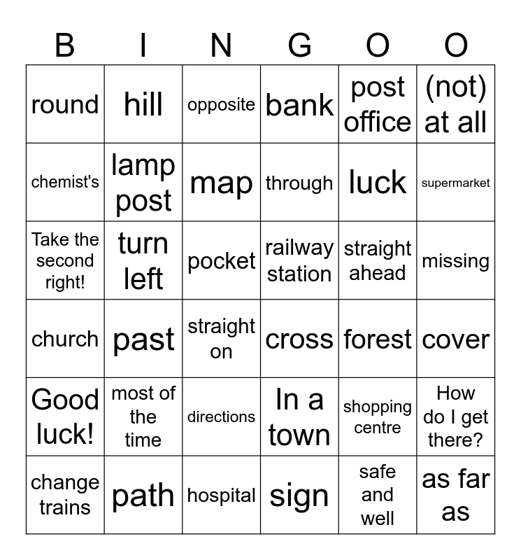 This bingo card has 36 words: In a town, directions, sign, chemist's, church, railway station, lamp post, hospital, post office, shopping centre, supermarket, bank, How do I get there?, turn left, through, round, Good luck!, straight ahead, Take the second right!, opposite, pocket, past, cross, straight on, forest, hill, luck, path, map, (not) at all, as far as, change trains, cover, missing, most of the time and safe and well.