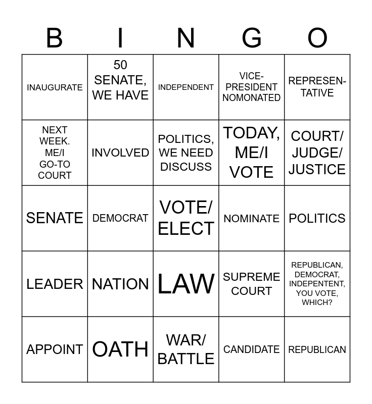 This bingo card has a free space and 29 words: APPOINT, CONSTITUTION, DEMOCRAT, GOVERNMENT, INAUGURATE, INDEPENDENT, INVOLVED, NATION, NOMINATE, OATH, POLITICS, REPUBLICAN, WAR/ BATTLE, CANDIDATE, COURT/ JUDGE/ JUSTICE, FREE/ FREEDOM, LAW, LEADER, REPRESEN-TATIVE, SENATE, SUPREME COURT, VICE- PRESIDENT, TODAY, ME/I VOTE, NEXT WEEK. ME/I GO-TO COURT, VICE- PRESIDENT NOMONATED, 50 SENATE, WE HAVE, REPUBLICAN, DEMOCRAT, INDEPENTENT, YOU VOTE, WHICH?, POLITICS, WE NEED DISCUSS and CONSTITUTION, IMPORTANT.