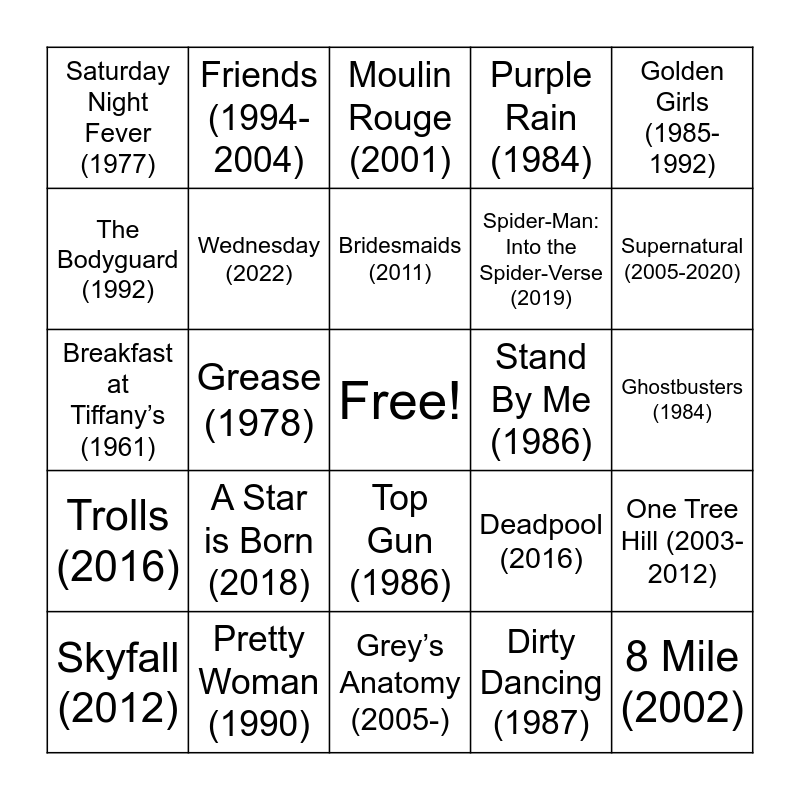 This bingo card has a free space and 32 words: Dirty Dancing (1987), The Karate Kid II (1986), Grease (1978), The Pink Panther (2006), Trolls (2016), Wednesday (2022), Golden Girls (1985-1992), One Tree Hill (2003-2012), Friends (1994-2004), Stranger Things (2016), Bridesmaids (2011), Moulin Rouge (2001), Dangerous Minds (1995), Toy Story (1995), Stand By Me (1986), Back to the Future (1985), Skyfall (2012), Breakfast at Tiffany’s (1961), Top Gun (1986), A Star is Born (2018), Deadpool (2016), 10 Things I Hate About You (1999), Ghostbusters (1984), Pretty Woman (1990), 8 Mile (2002), Purple Rain (1984), Spider-Man: Into the Spider-Verse (2019), The Bodyguard (1992), Saturday Night Fever (1977), Grey’s Anatomy (2005-), Peaky Blinders (22013-2022) and Supernatural (2005-2020).