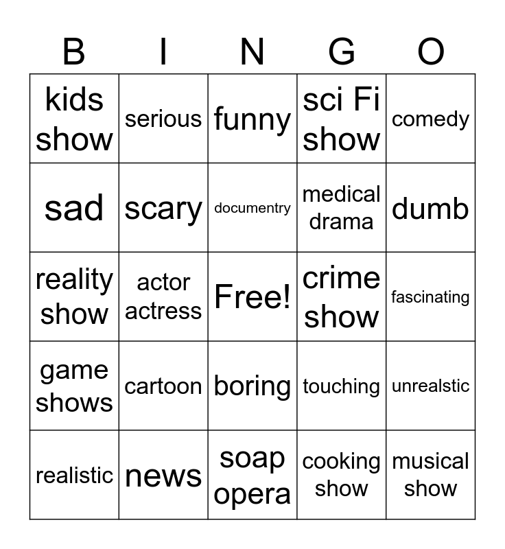 This bingo card has a free space and 24 words: cartoon, news, documentry, realistic, comedy, kids show, sad, serious, crime show, boring, medical drama, reality show, touching, unrealstic, scary, cooking show, fascinating, funny, dumb, actor actress, musical show, game shows, sci Fi show and soap opera.