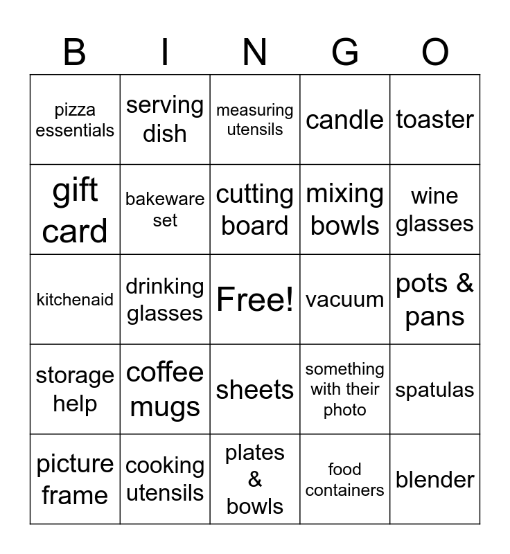 This bingo card has a free space and 30 words: cooking utensils, honeymoon fun, drinking glasses, cooler, pizza essentials, measuring utensils, bakeware set, sheets, vacuum, plates & bowls, pots & pans, blender, food containers, towels, wine glasses, mr & mrs sign, something with their photo, storage help, coffee mugs, toaster, kitchenaid, ramekins, serving dish, mixing bowls, gift card, candle, spatulas, picture frame, cutting board and blanket.