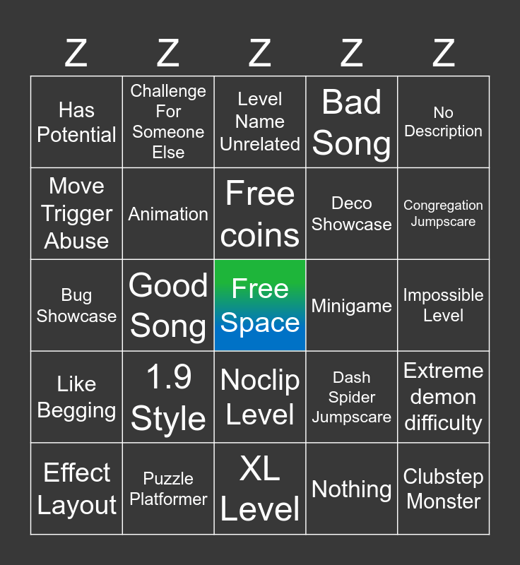 This bingo card has a free space and 89 words: Triple Spike, Auto, Noclip Level, Main Level Song, Copy of popular level, Copy Mark, Good But Unsynced Gameplay, "Make your own" level, Actually good gameplay, Actually good decoration, Song does not sync, Incorrect grammar, Extreme demon difficulty, Impossible Level, Good sync, Free coins, Claims to be impossible, Uses NONG, High object count, Flashing lights, Rated Level, Long Platformer, XL Level, Cool Gimmick, Bug Showcase, Puzzle Platformer, Level Remake, Funny Level, Contains Startpos, Uses Popular song, Bad Song, Good Song, Unknown Song, Has Potential, Big Lag, Level Name Unrelated, Move Trigger Abuse, Unreadable Gameplay, Congregation Jumpscare, Effect Layout, Like Begging, Unfinished Collab, Finished Collab, Level contains Insult, Dash Spider Jumpscare, Minigame, Recursive Levels, Effect Abuse, Bloodbath Jumpscare, Challenge For Someone Else, Low Object Challenge, ZZZZierra Challenge, Never Clear, Layout, Nine Circles, Less than 8 digit ID, Secret Way, 1.0 Style, Unique Deco, Unique Gameplay, Youtube Shorts ahh Level, Unbalanced Gameplay, Unbalanced Deco, Stacked Portals, Reference to Other Video Game, Smiley Face, "Die" Text, Red and Black Deco, Pre-2.1 Level, 1.9 Style, Clubstep Monster, Art Showcase, Crash Trigger, Deco Showcase, Animation, Nothing, Separate G1 and G2 Colours, More Likes Than Downloads, Only comments by creator, Praise in comments, No Description, Colour Tags in Description, ZZZZierra One-Attempts Level, Default Blue BG, Low Detail Mode, RNG, Creo Song, Straight Fly and Michigun Tribute.
