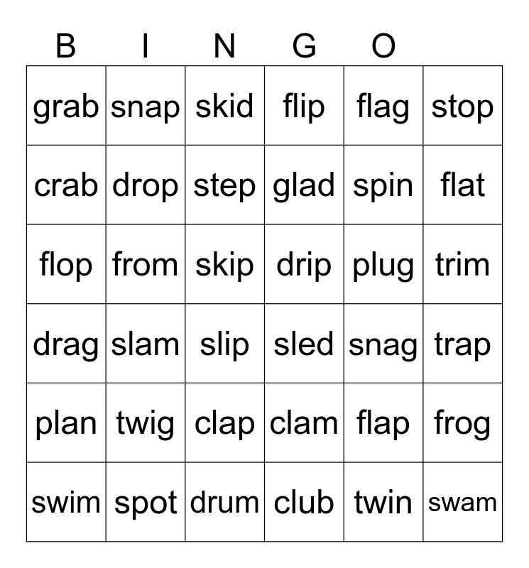 This bingo card has 36 words: clam, clap, club, crab, drag, drip, drop, drum, flag, flap, flat, flip, frog, from, glad, grab, plan, plug, flop, skid, skip, slam, sled, slip, snag, snap, spin, spot, step, stop, swam, swim, trap, trim, twig and twin.