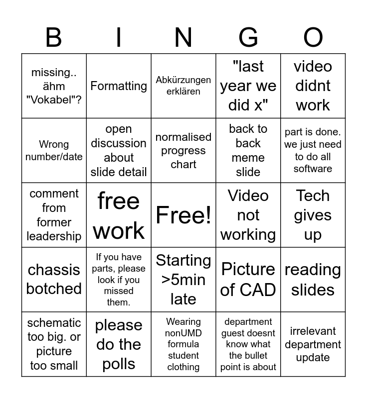 This bingo card has a free space and 24 words: If you have parts, please look if you missed them., please do the polls, normalised progress chart, schematic too big. or picture too small, video didnt work, missing.. ähm "Vokabel"?, Wrong number/date, Formatting, Video not working, Starting >5min late, back to back meme slide, comment from former leadership, Picture of CAD, reading slides, open discussion about slide detail, department guest doesnt know what the bullet point is about, Tech gives up, Abkürzungen erklären, part is done. we just need to do all software, free work, irrelevant department update, chassis botched, "last year we did x" and Wearing nonUMD formula student clothing.