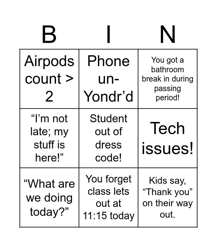 This bingo card has a free space and 8 words: Tech issues!, You got a bathroom break in during passing period!, Phone un-Yondr’d, “What are we doing today?”, Airpods count > 2, Kids say, “Thank you” on their way out., “I’m not late; my stuff is here!” and You forget class lets out at 11:15 today.