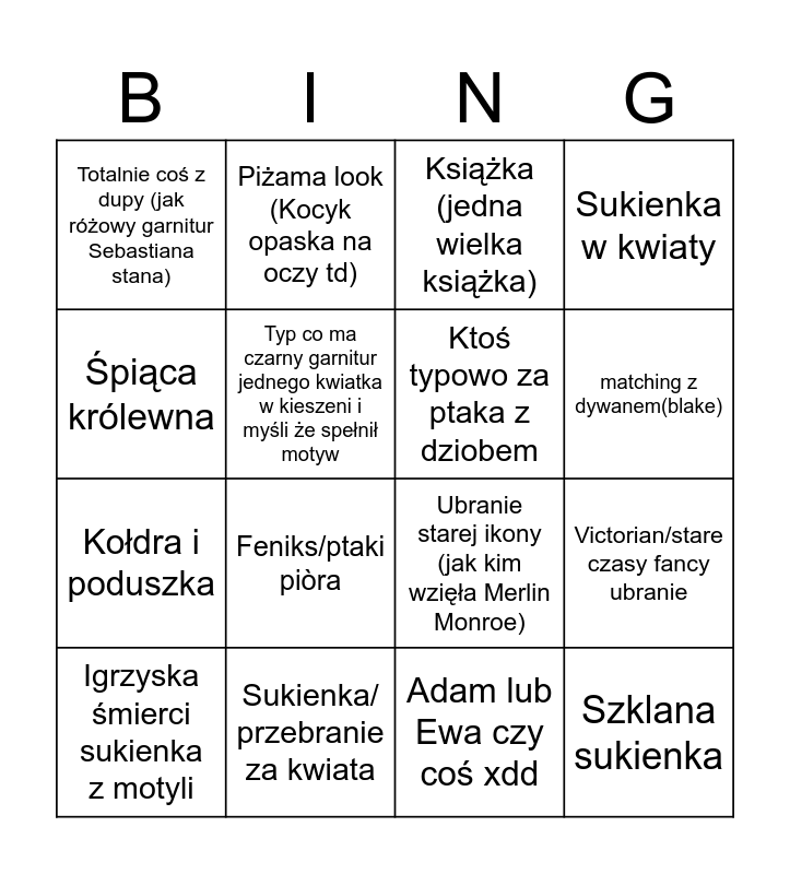 This bingo card has 16 words: Igrzyska śmierci sukienka z motyli, Sukienka/ przebranie za kwiata, Książka (jedna wielka książka), Sukienka w kwiaty, Śpiąca królewna, Piżama look (Kocyk opaska na oczy td), Ubranie starej ikony (jak kim wzięła Merlin Monroe), Victorian/stare czasy fancy ubranie, Totalnie coś z dupy (jak różowy garnitur Sebastiana stana), Typ co ma czarny garnitur jednego kwiatka w kieszeni i myśli że spełnił motyw, Adam lub Ewa czy coś xdd, matching z dywanem(blake), Kołdra i poduszka, Feniks/ptaki piòra, Ktoś typowo za ptaka z dziobem and Szklana sukienka.