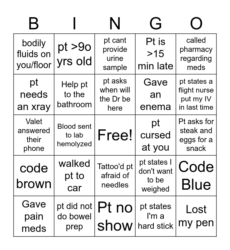 This bingo card has a free space and 24 words: walked pt to car, pt did not do bowel prep, pt asks when will the Dr be here, Gave pain meds, called pharmacy regarding meds, bodily fluids on you/floor, pt needs an xray, pt >9o yrs old, pt cursed at you, Tattoo'd pt afraid of needles, Gave an enema, Valet answered their phone, pt states I don't want to be weighed, Code Blue, Help pt to the bathroom, pt states I'm a hard stick, Pt asks for steak and eggs for a snack, pt cant provide urine sample, pt states a flight nurse put my IV in last time, Blood sent to lab hemolyzed, Lost my pen, code brown, Pt is >15 min late and Pt no show.