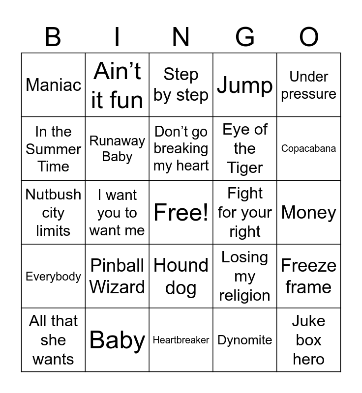 This bingo card has a free space and 54 words: What is love, Everybody, The Shoop Shoop Song, Piano Man, Hound dog, Senorita, Jump, Friends In Low Places, In the Summer Time, It takes two, Maniac, I’m on my way, Baby, All that she wants, It’s not unusual, Heartbreaker, Juke box hero, Eye of the Tiger, Hey Jude, Money, Losing my religion, We will rock you, Fight for your right, Under pressure, High Hopes, Ain’t it fun, I don’t want to be, There’s nothing holding me back, Attention, Dynomite, Brave, Boot Scootin boogie, Last name, Bad blood, Step by step, You got it ( the right stuff), Nutbush city limits, Freeze frame, Riptide, Runaway Baby, Hey soul sister, I’m yours, Fighter, Me and Julio down by the schoolyard, Pinball Wizard, Slow ride, Lido Shuffle, Rockin Robin, Don’t go breaking my heart, I want you to want me, Copacabana, Love shack, You can’t hurry love and Ain’t no Mountain high enough.