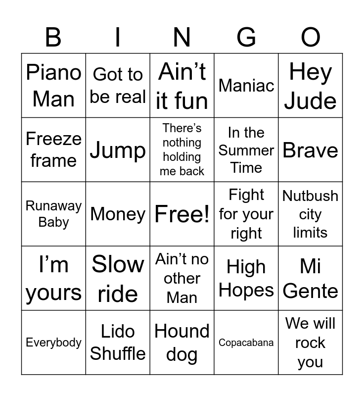 This bingo card has a free space and 57 words: What is love, Everybody, The Shoop Shoop Song, Piano Man, Hound dog, Senorita, Jump, Friends In Low Places, In the Summer Time, It takes two, Maniac, All that she wants, It’s not unusual, Heartbreaker, Juke box hero, Eye of the Tiger, Hey Jude, Money, Losing my religion, We will rock you, Fight for your right, Under pressure, High Hopes, Ain’t it fun, I don’t want to be, There’s nothing holding me back, Attention, Dynomite, Brave, Boot Scootin boogie, Last name, Bad blood, Step by step, You got it ( the right stuff), Nutbush city limits, Freeze frame, Riptide, Runaway Baby, Hey soul sister, I’m yours, Got to be real, Ain’t no other Man, Jumpin, Jumpin, Fighter, Me and Julio down by the schoolyard, Pinball Wizard, Slow ride, Lido Shuffle, Rockin Robin, Don’t go breaking my heart, I want you to want me, Copacabana, Love shack, You can’t hurry love, Ain’t no Mountain high enough, Mi Gente and We Didn’t Start The Fire.
