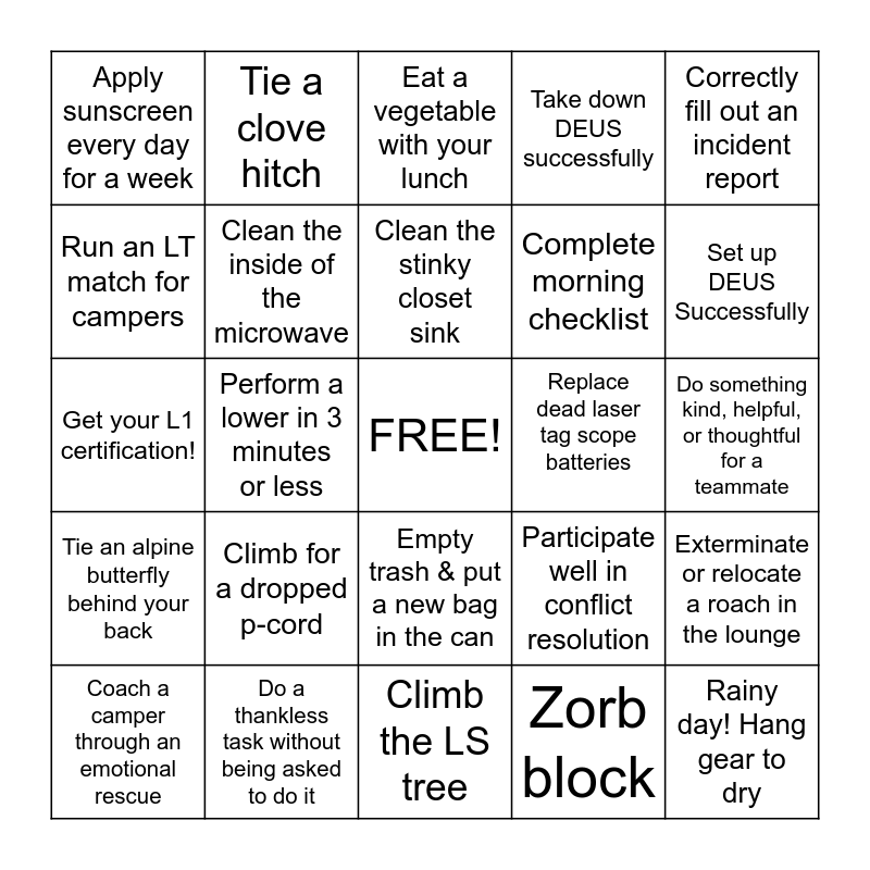 This bingo card has a free space and 29 words: Coach a camper through an emotional rescue, Complete an assigned course maintenance task, Perform a lower in 3 minutes or less, Clean the inside of your water reservoir (with soap), Apply sunscreen every day for a week, Eat a vegetable with your lunch, Clean the inside of the microwave, Climb for a dropped p-cord, Replace dead laser tag scope batteries, Do a thankless task without being asked to do it, Do something kind, helpful, or thoughtful for a teammate, Rainy day! Hang gear to dry, Climb the LS tree, Zorb block, Set up DEUS Successfully, Tie a super 8 with finishing knot while your eyes are closed, Empty trash & put a new bag in the can, Tie an alpine butterfly behind your back, Correctly fill out an incident report, Get your L1 certification!, Participate well in conflict resolution, Put gas in Terry, Complete morning checklist, Run an LT match for campers, Take down DEUS successfully, Tie a clove hitch, Exterminate or relocate a roach in the lounge, Clean the stinky closet sink and Go the whole summer without running yourself over with a vehicle.
