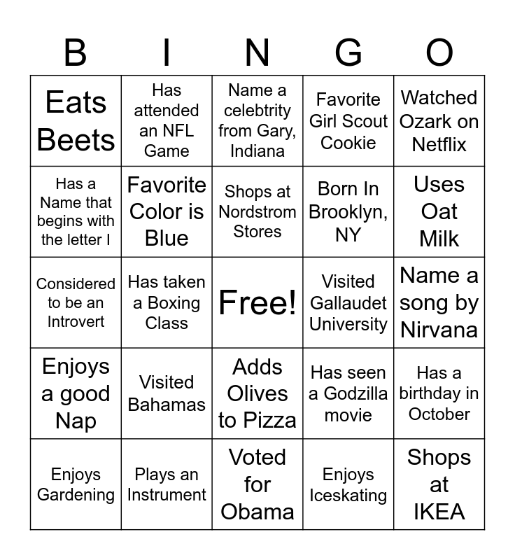 This bingo card has a free space and 24 words: Visited Bahamas, Plays an Instrument, Shops at Nordstrom Stores, Enjoys Gardening, Watched Ozark on Netflix, Eats Beets, Has a Name that begins with the letter I, Has attended an NFL Game, Visited Gallaudet University, Adds Olives to Pizza, Born In Brooklyn, NY, Considered to be an Introvert, Has seen a Godzilla movie, Has a birthday in October, Favorite Color is Blue, Enjoys Iceskating, Name a song by Nirvana, Name a celebtrity from Gary, Indiana, Uses Oat Milk, Has taken a Boxing Class, Shops at IKEA, Enjoys a good Nap, Favorite Girl Scout Cookie and Voted for Obama.
